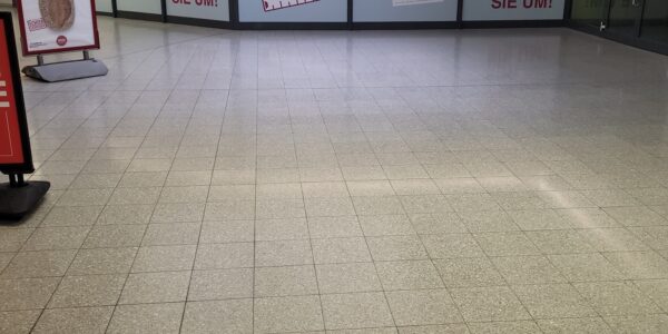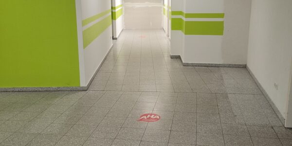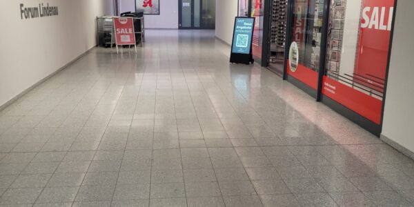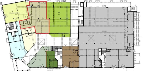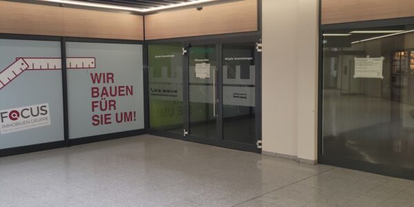 Die hier angebotene Gewerbefläche (im Grundriss rot markiert) ist barrierefrei erreichbar und befindet sich in der Passage, welche im Zuge des Um- und Neubaus auch eine Modernisierung erfahren hat.