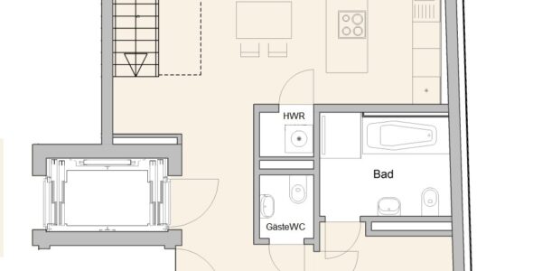 Praktisch ergänzt wird das Angebot durch ein Gästebad und einen Hauswirtschaftraum mit Anschlußmöglichkeit für Waschmaschine und Trockner.