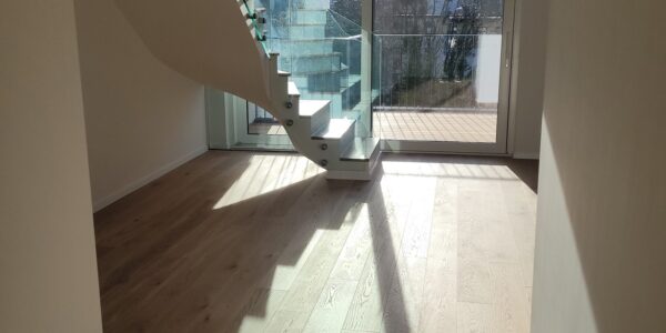 Ein hochwertiger Parkettboden sorgt in allen Wohnräumen für ein natürliches Ambiente, während die individuell regelbare Fußbodenheizung in jedem Raum eine angenehme Wärme garantiert.
