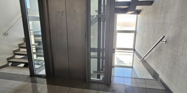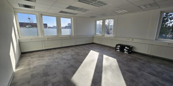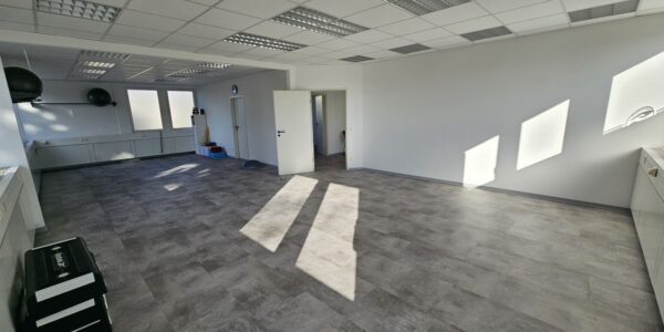 Große Fensterflächen sorgen in den Räumen für viel Tageslicht und eine angenehme Arbeitsatmosphäre. Die Einheit ist mit einem modernen, pflegeleichten Vinylboden in Steinoptik ausgestattet. Abgehängte Rasterdecken mit integrierter Beleuchtung gewährleisten eine gleichmäßige Ausleuchtung der Räume.