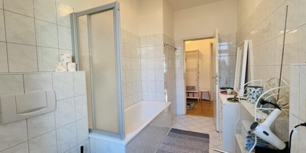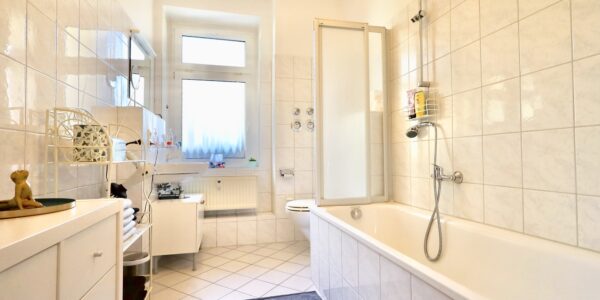 Auch das Bad lässt keine Wünsche offen. Idealerweise handelt es sich um ein Tageslichtbad, welches bis zu einer Höhe von ca. 2,00 m gefliest ist. Eine Abtrennung sorgt dafür, dass Sie bequem in der großen Wanne duschen können.
