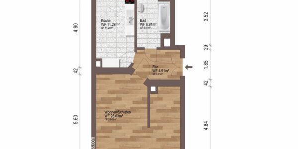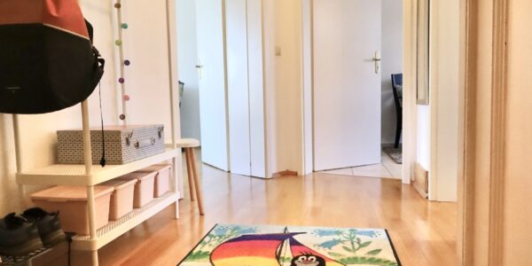 Die mit Parkett (Eiche) und Fliesen ausgestattete Wohnung wirkt mit ihren ca. 2,70 m (abgehangene) Deckenhöhe angenehm luftig und gemütlich. Die ursprünglich knapp 50 m2 sind optimal aufgeteilt (Erweiterung durch Balkonanbau).