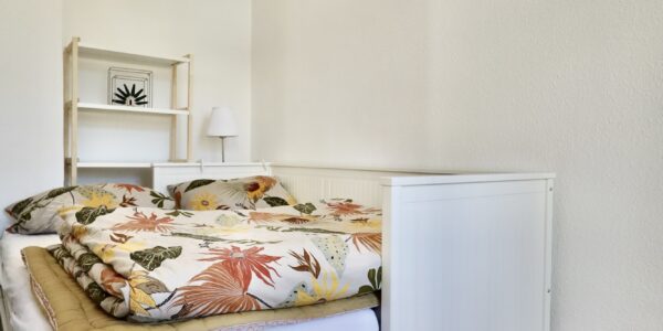Der Schlafbereich selbst ist geschickt gestaltet. Ein Doppelbett findet seinen Platz versteckt hinter der Trennwand, so dass die optische Trennung der „Tag“-“Nacht“-Bereiche sehr gut gelingt.
