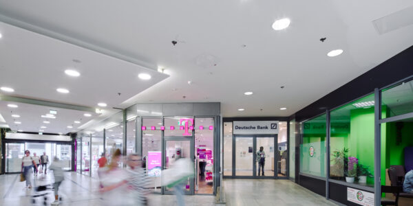 Hinter der ansprechenden Fassade verbergen sich drei Einkaufsebenen mit insgesamt 45 Geschäften, verschiedene gastronomische Einrichtungen in der Mall, drei Büroetagen und ein Parkhaus/eine Tiefgarage auf mehreren Ebenen mit insgesamt 347 Stellplätzen.